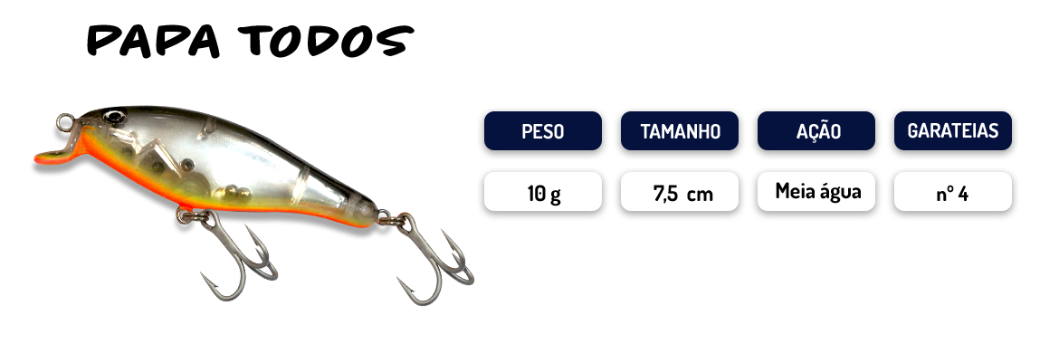 Indicada para a grande maioria dos peixes predadores de médio porte. O formato de sua barbela permite que a isca emita ruídos semelhantes aos dos poppers quando aplicamos toques curtos de ponta de vara ainda com a isca na superfície, ou seja, antes de iniciarmos o recolhimento para que e isca execute seu trabalho clássico de meia-água.